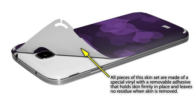 • Decal style vinyl skin covers front and back of Samsung Galaxy S4 phone.