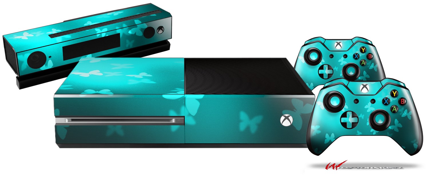 Bokeh Butterflies Neon Teal - Holiday Bundle Decal Style Skin fits XBOX One Console Original, Kinect and 2 Controllers (XBOX SYSTEM NOT INCLUDED)