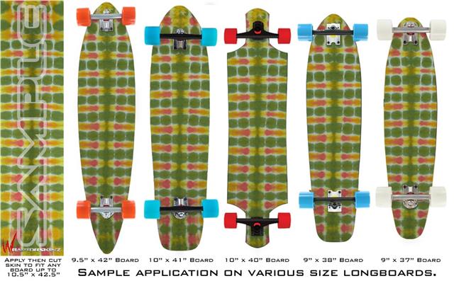 Our longboard skins are made so that one size fits boards up to 10” wide x 42” long. This means after applying the skin it you will trimming to fit you’re the shape of your board with a sharp utility knife.
