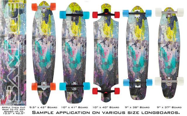 Our longboard skins are made so that one size fits boards up to 10” wide x 42” long. This means after applying the skin it you will trimming to fit you’re the shape of your board with a sharp utility knife.