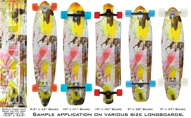 Our longboard skins are made so that one size fits boards up to 10” wide x 42” long. This means after applying the skin it you will trimming to fit you’re the shape of your board with a sharp utility knife.