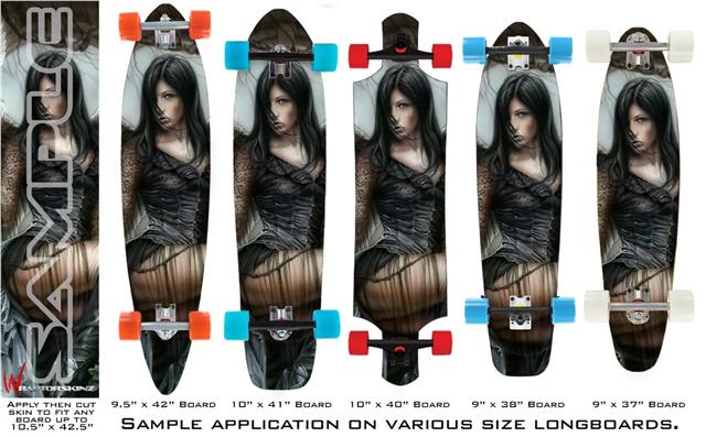 Our longboard skins are made so that one size fits boards up to 10” wide x 42” long. This means after applying the skin it you will trimming to fit you’re the shape of your board with a sharp utility knife.