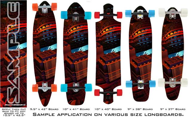 Our longboard skins are made so that one size fits boards up to 10” wide x 42” long. This means after applying the skin it you will trimming to fit you’re the shape of your board with a sharp utility knife.
