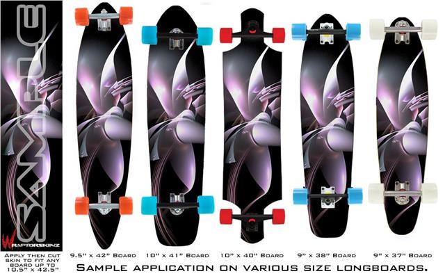 Our longboard skins are made so that one size fits boards up to 10” wide x 42” long. This means after applying the skin it you will trimming to fit you’re the shape of your board with a sharp utility knife.