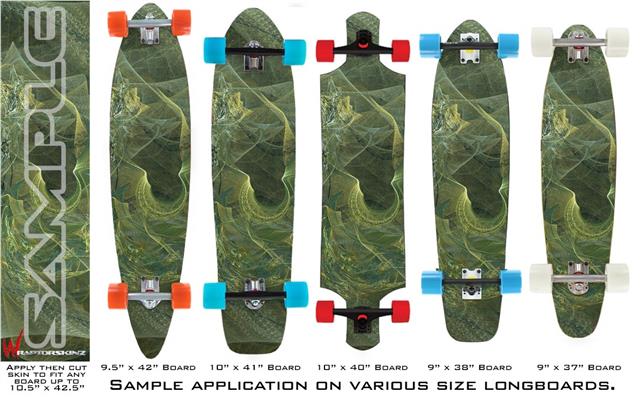 Our longboard skins are made so that one size fits boards up to 10” wide x 42” long. This means after applying the skin it you will trimming to fit you’re the shape of your board with a sharp utility knife.