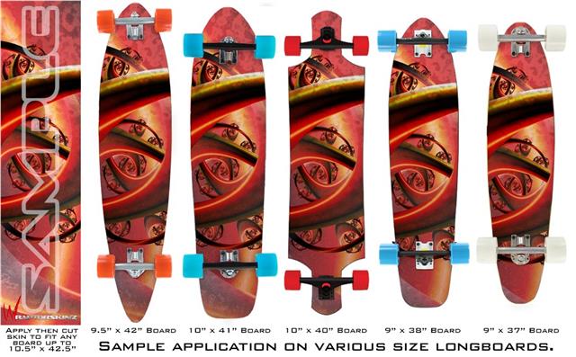 Our longboard skins are made so that one size fits boards up to 10” wide x 42” long. This means after applying the skin it you will trimming to fit you’re the shape of your board with a sharp utility knife.