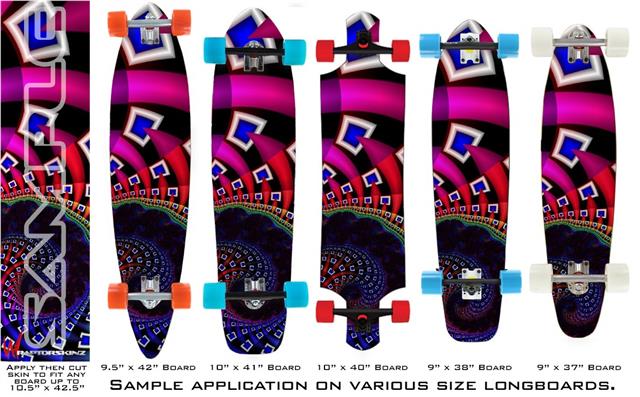 Our longboard skins are made so that one size fits boards up to 10” wide x 42” long. This means after applying the skin it you will trimming to fit you’re the shape of your board with a sharp utility knife.