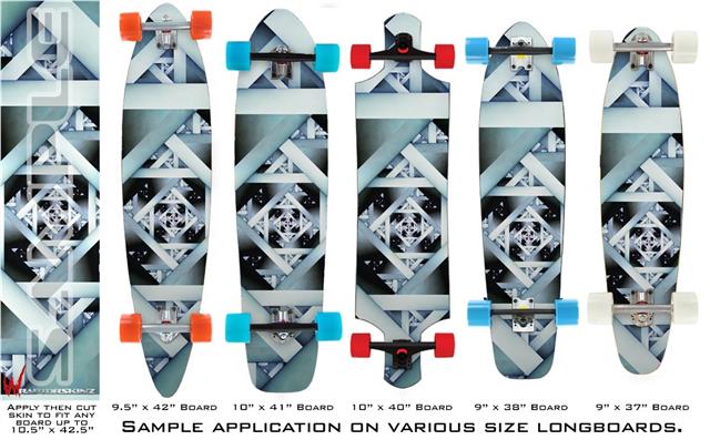 Our longboard skins are made so that one size fits boards up to 10” wide x 42” long. This means after applying the skin it you will trimming to fit you’re the shape of your board with a sharp utility knife.