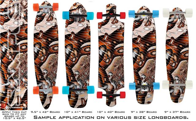 Our longboard skins are made so that one size fits boards up to 10” wide x 42” long. This means after applying the skin it you will trimming to fit you’re the shape of your board with a sharp utility knife.