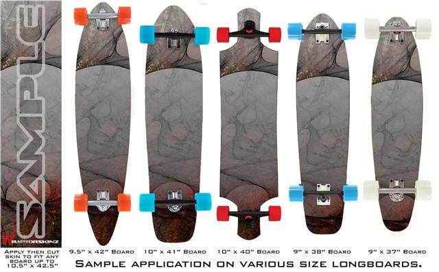 Our longboard skins are made so that one size fits boards up to 10” wide x 42” long. This means after applying the skin it you will trimming to fit you’re the shape of your board with a sharp utility knife.
