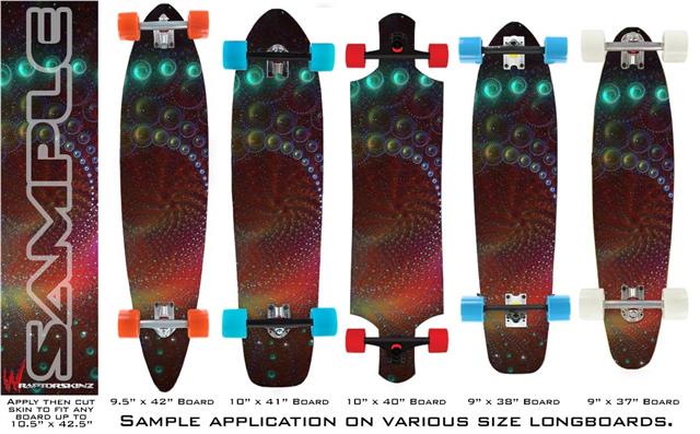 Our longboard skins are made so that one size fits boards up to 10” wide x 42” long. This means after applying the skin it you will trimming to fit you’re the shape of your board with a sharp utility knife.