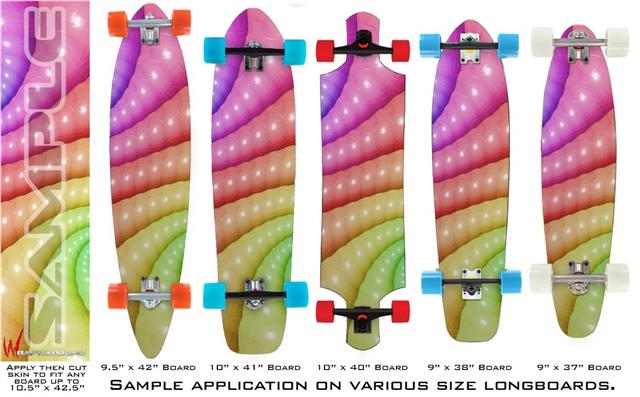 Our longboard skins are made so that one size fits boards up to 10” wide x 42” long. This means after applying the skin it you will trimming to fit you’re the shape of your board with a sharp utility knife.