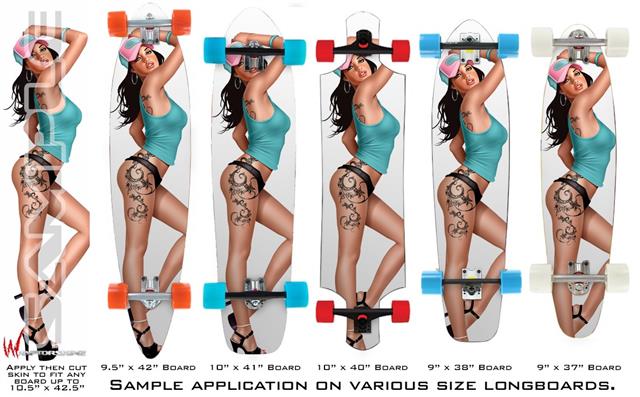 Our longboard skins are made so that one size fits boards up to 10” wide x 42” long. This means after applying the skin it you will trimming to fit you’re the shape of your board with a sharp utility knife.