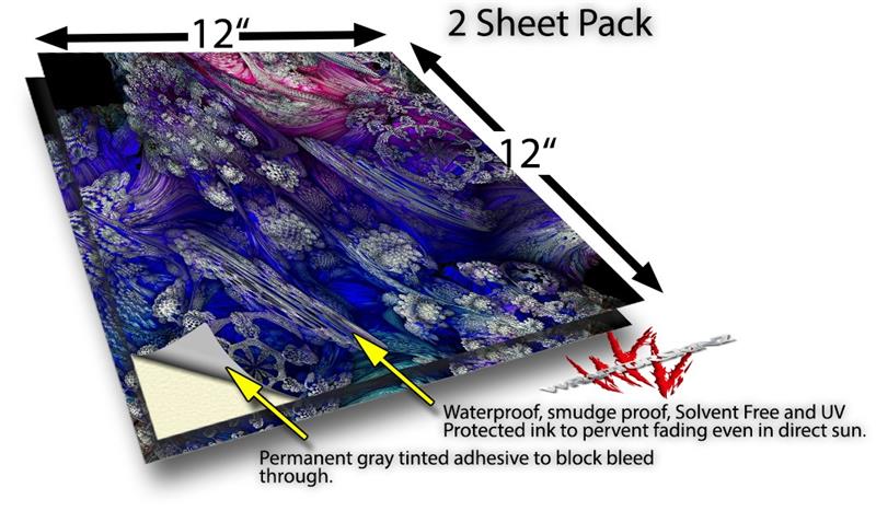 WraptoSkinz™ skin vinyl craft sheets are printed using superb photo quality designs and vibrant colors printed with special UV Protected fade resistant inks that last even in direct sun for years. Unlike other brands our inks are NOT solvent based. WraptorSkinz are a manufactured from professional grade 3mill vinyl. These sheets are waterproof, the designs will not run or smear even if submerged in water.
