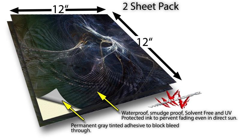 WraptoSkinz™ skin vinyl craft sheets are printed using superb photo quality designs and vibrant colors printed with special UV Protected fade resistant inks that last even in direct sun for years.  Unlike other brands our inks are NOT solvent based. WraptorSkinz are a manufactured from professional grade 3mill vinyl. These sheets are waterproof, the designs will not run or smear even if submerged in water.