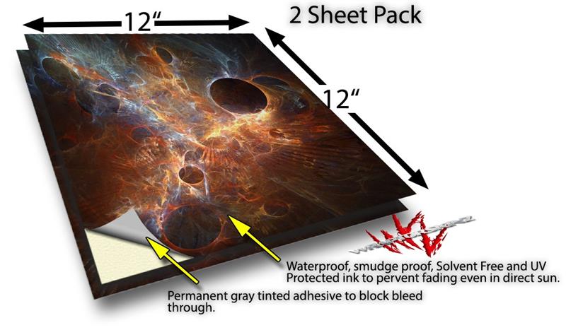 WraptoSkinz™ skin vinyl craft sheets are printed using superb photo quality designs and vibrant colors printed with special UV Protected fade resistant inks that last even in direct sun for years. Unlike other brands our inks are NOT solvent based. WraptorSkinz are a manufactured from professional grade 3mill vinyl. These sheets are waterproof, the designs will not run or smear even if submerged in water.