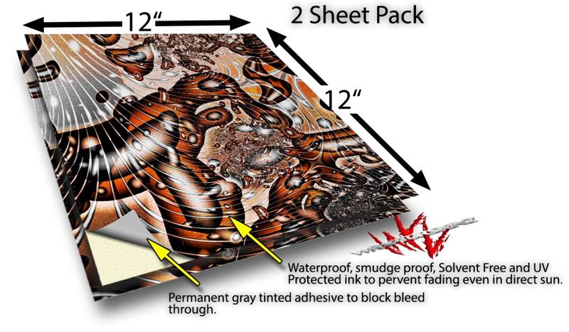 WraptoSkinz™ skin vinyl craft sheets are printed using superb photo quality designs and vibrant colors printed with special UV Protected fade resistant inks that last even in direct sun for years. Unlike other brands our inks are NOT solvent based. WraptorSkinz are a manufactured from professional grade 3mill vinyl. These sheets are waterproof, the designs will not run or smear even if submerged in water.