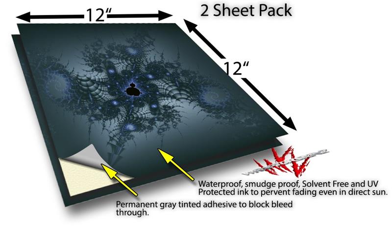 WraptoSkinz™ skin vinyl craft sheets are printed using superb photo quality designs and vibrant colors printed with special UV Protected fade resistant inks that last even in direct sun for years.  Unlike other brands our inks are NOT solvent based. WraptorSkinz are a manufactured from professional grade 3mill vinyl. These sheets are waterproof, the designs will not run or smear even if submerged in water.