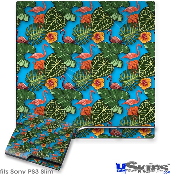 Decal Skin compatible with Sony PS3 Slim Famingos and Flowers Blue Medium